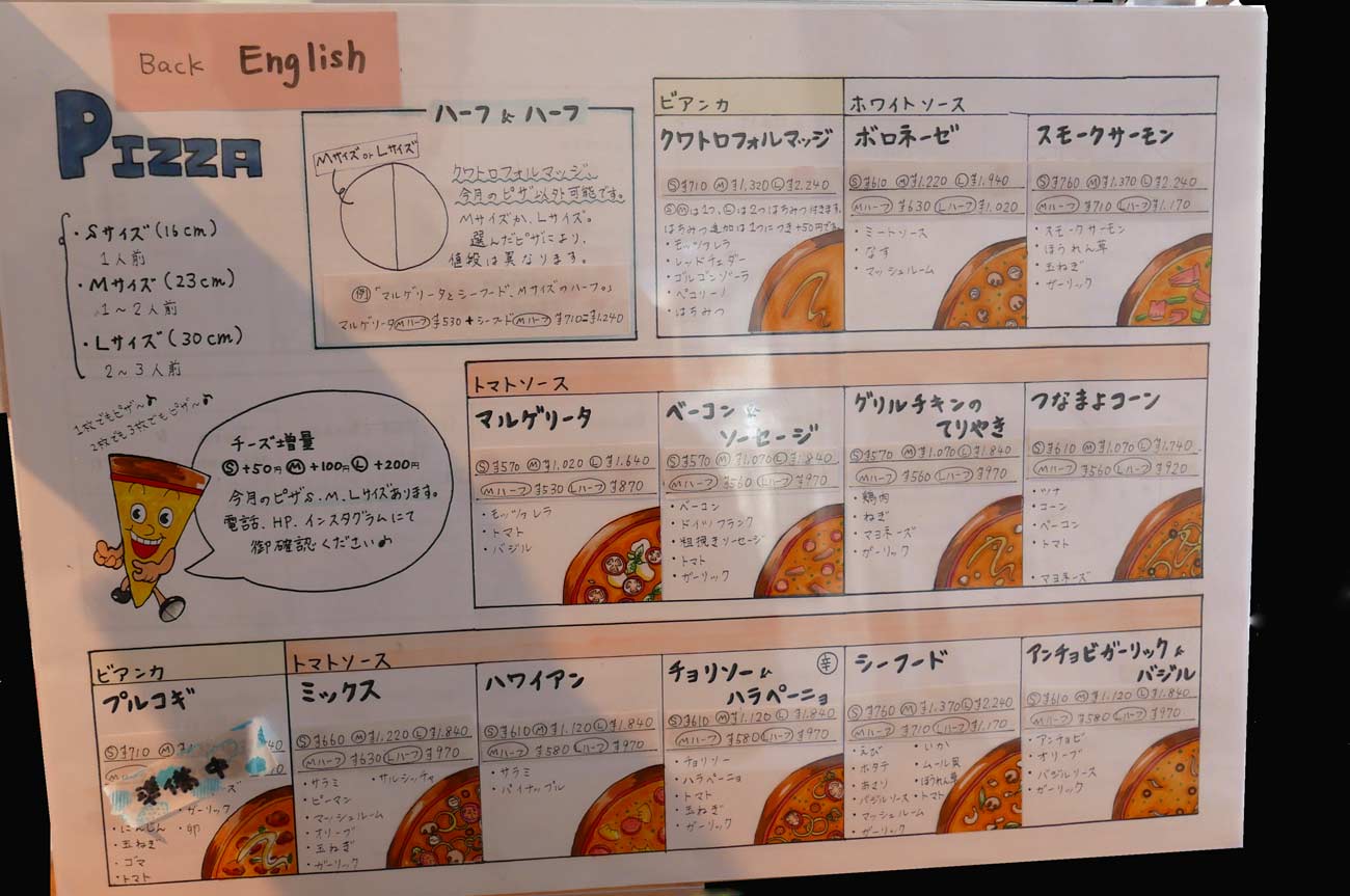 メニューを見ると魅力的なものが並んでいてちょっと迷いました。「ボロネーゼ」、「スモークサーモン」、「アンチョビガーリック&バジル」・・・