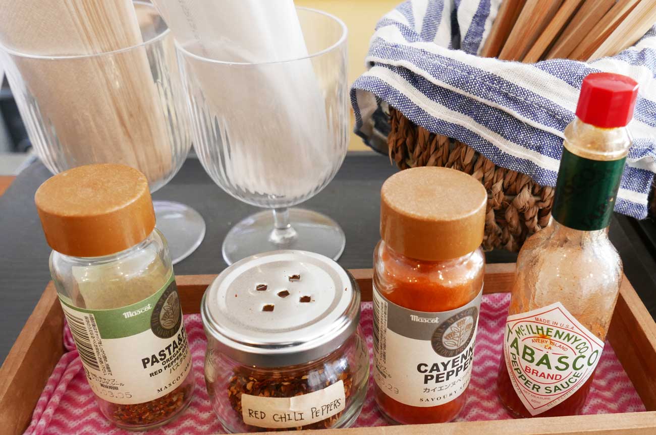 調味料は「タバスコ」「カイエンヌペッペー」「RED CHILI PEPPERS」「パスタ&ピザ(唐辛子&オレガノ&バジル等)」など数種類揃っています。