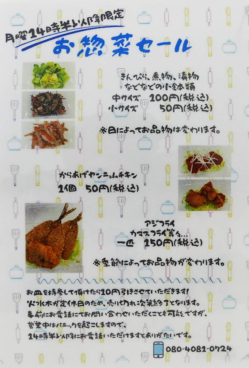 月曜14:30より販売。お惣菜は何と中サイズが100円、小サイズが50円と超破格値!!
