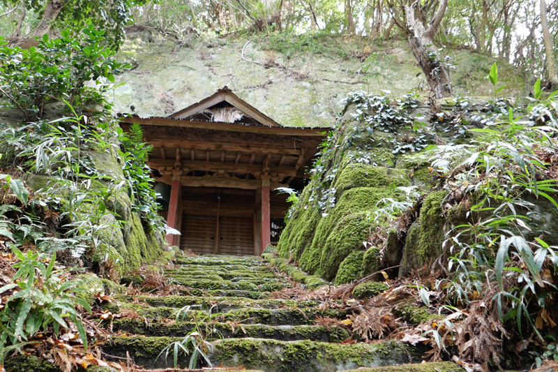 絶壁の岩穴にめり込むようにして建てられています。屋根と壁は破損しています。壁に墨で「大正十五年三月」とあり他の文字は読み取り不明。