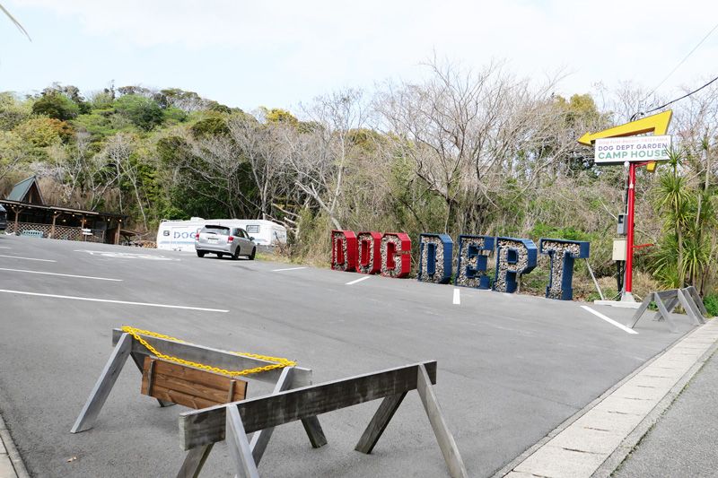 案内板を左折して150mほど進むと左側に「DOG DEPT」の看板と駐車場が見えてきます。